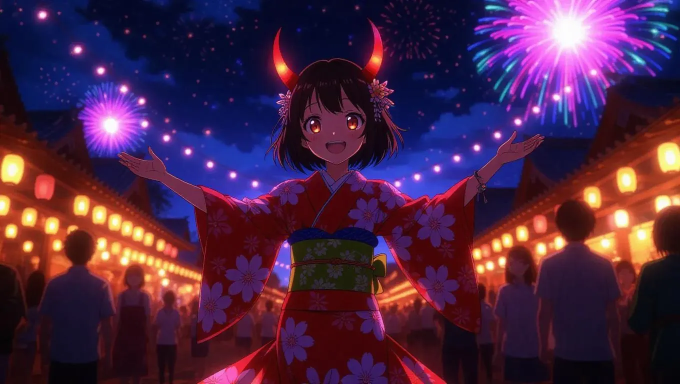 A lively anime demon girl with glowing red horns and shimmering wings dances in a crowded festival at night. She wears a vibrant kimono adorned with floral patterns that flows as she twirls. Her eyes shine with joy as she interacts with the festival-goers. Fireworks explode in a colorful display behind her, casting bright shadows and highlights. The scene is awash in a variety of colorful lights, creating a festive and celebratory atmosphere. The style is a mix of traditional and anime aesthetics, enhancing the joyful and spirited nature of the image.