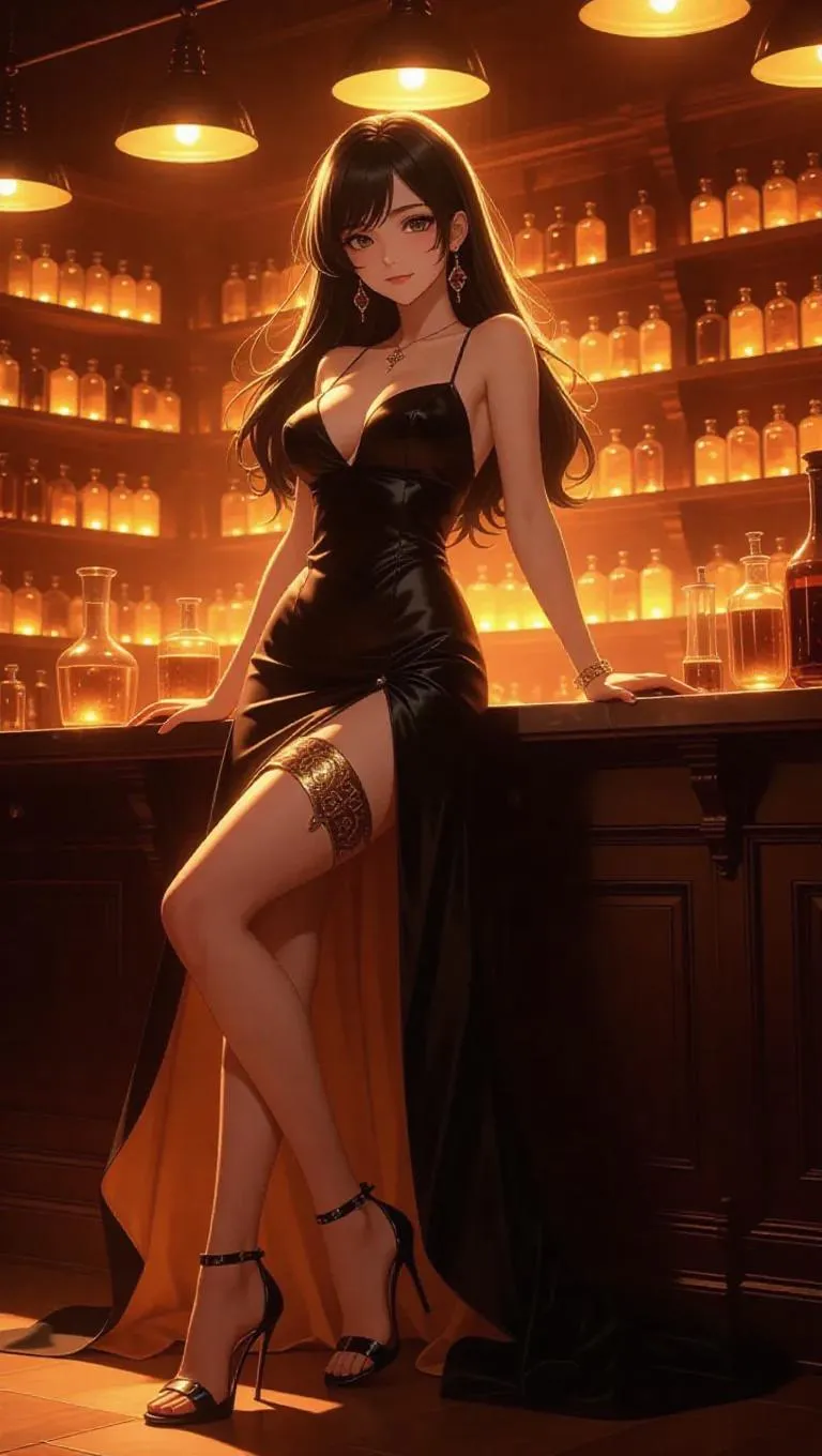 A stylish anime sorceress leans against a polished counter, her elegant gown and high-heeled sandals accentuating her figure. Her eyes glint flirtatiously under the warm, ambient magical lights, which cast a soft glow over her. Rows of glowing potions line the background, adding a vibrant touch to the scene. The lighting is warm and inviting, creating a cozy and intimate atmosphere. Style: Anime.