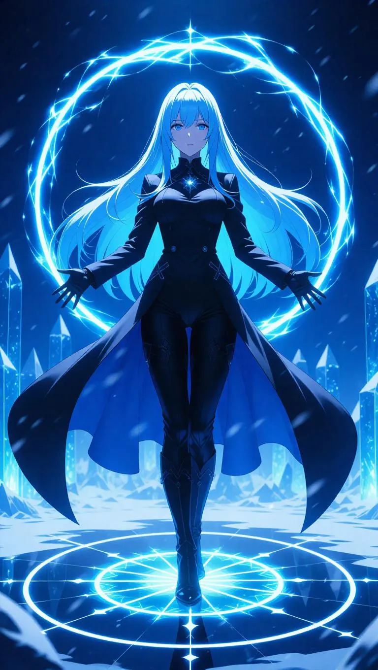 An anime sorceress with long, straight icy blue hair stands in a summoning circle, her fitted suit and high boots accentuating her figure. She summons magic, with swirling frost encircling her, casting a chill and sparkling light. The wind howls around her, adding a chilling energy to the scene. The environment is freezing and otherworldly, with ice sculptures in the background. The lighting is crisp and pristine, highlighting her fierce expression and the intricate details of the magic circles. Style: Anime, with a touch of winter and power.