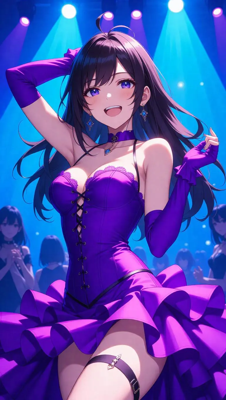 An anime model in a violet lace corset dress and wrist-length gloves poses backstage at a glamorous fashion show. She twirls joyfully, her wedges catching the glint of studio spotlights. The backstage area is dimly lit, with the cool, spotlight creating sharp contrasts and highlighting her lively, expressive face. The style is a blend of casual fashion and anime aesthetics, emphasizing fun lines and whimsical shadows.
