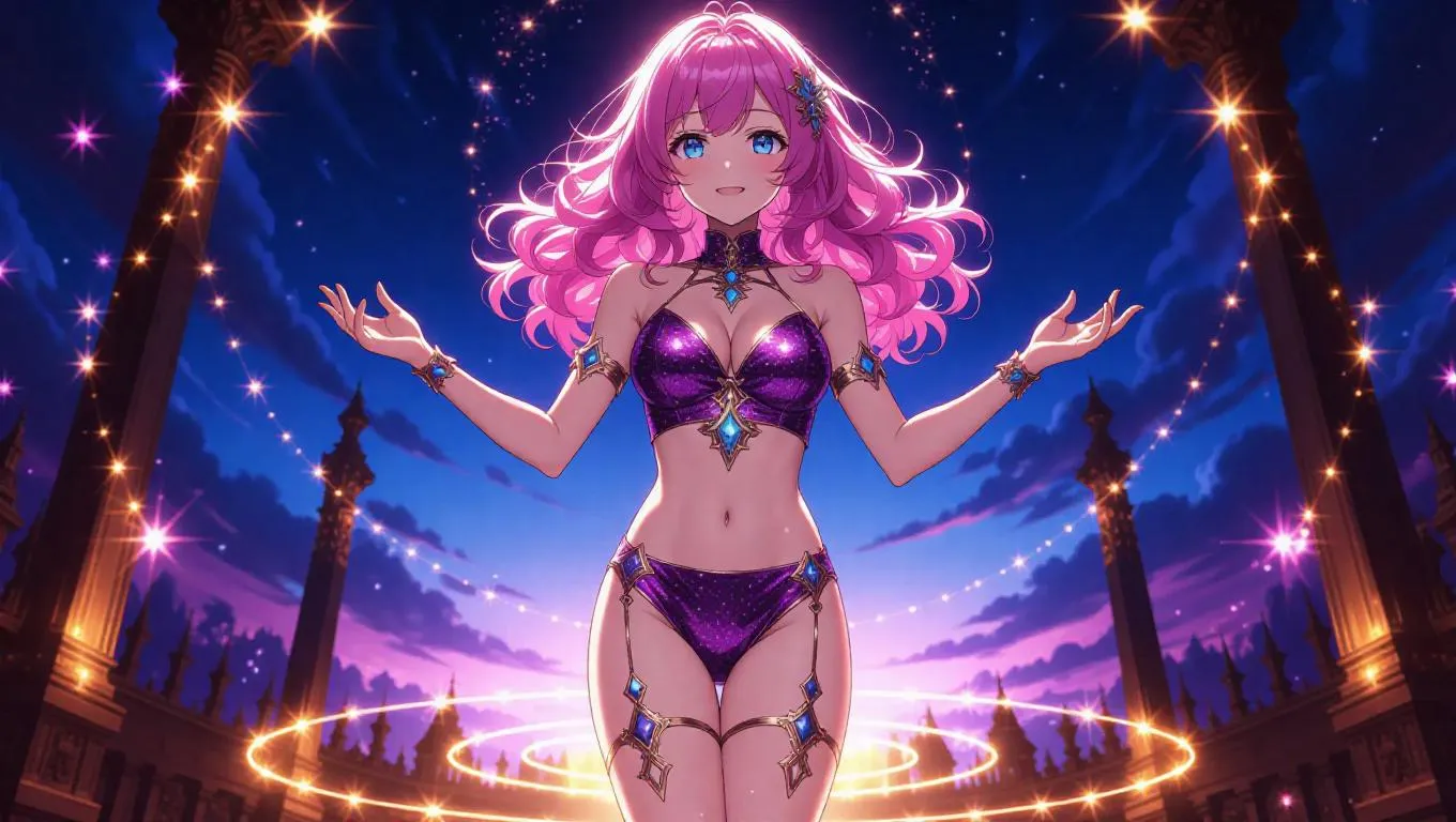 An anime sorceress with waist-length curly pink hair stands in a summoning circle, her sequined outfit and wedges accentuating her figure. She summons magic, with sparkling stars encircling her, casting a dazzling light. The wind twirls around her, adding a festive energy to the scene. The environment is celebratory and vibrant, with fireworks in the background. The lighting is bright and festive, highlighting her joyful expression and the intricate details of the magic circles. Style: Anime, with a touch of celebration.