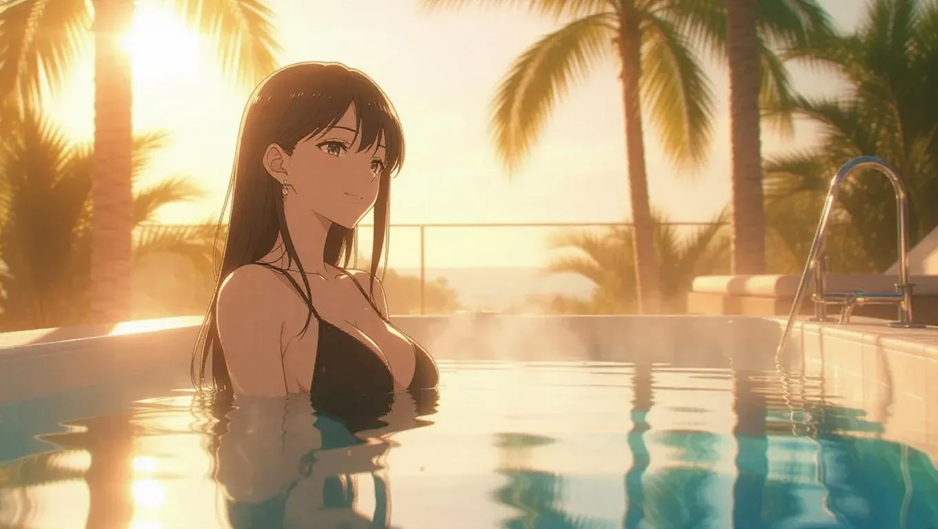A slender woman in a chic outfit steps into a tranquil hot tub, surrounded by palm trees on a sun-drenched terrace. Her straight hair glistens as she relaxes, her peaceful look shows her enjoyment. Warm steam rises around her, mingling with gentle music. Soft reflections shimmer on the water, enhancing the tranquil and luxurious atmosphere. The scene is flooded with warm sunshine, creating a cozy and inviting ambiance. Style: Anime.