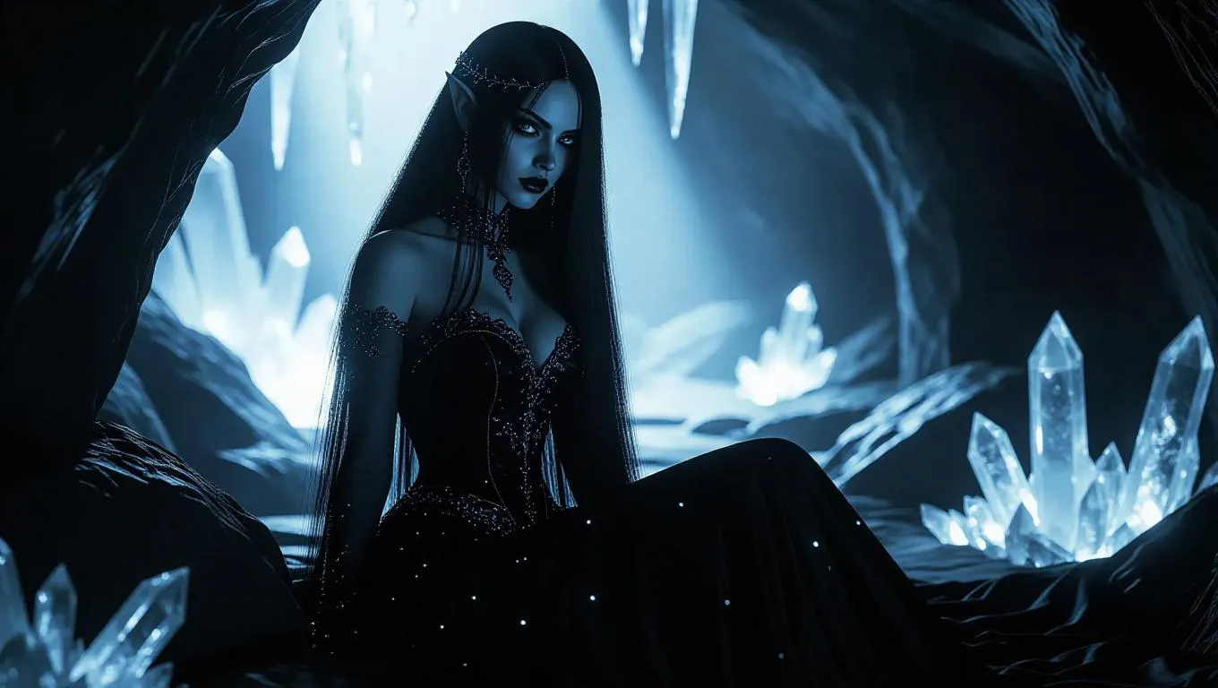 A brooding dark elf queen in a midnight black gown, embroidered with silver moons, sits in a shadowy alcove. Her long black hair flows like the night sky, and her intense gray eyes pierce the darkness. She is set against an underground cavern backdrop, with shimmering crystals reflecting light, creating a mysterious and captivating atmosphere. The scene is illuminated by cool, sparkling crystal light, enhancing the enigmatic and alluring mood. Style: Realistic fantasy.