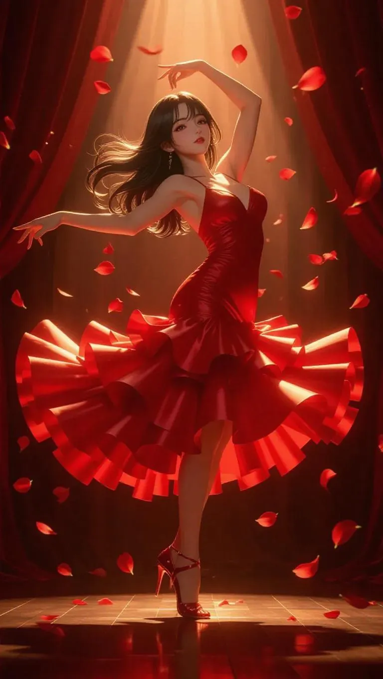 A sultry anime dancer in a red flamenco dress with tiered layers is frozen mid-spin, her body elegantly arched. Rose petals swirl around her, illuminated by warm amber lights that cast soft highlights on her flowing dress and create dramatic shadows. The background is an empty stage with velvet curtains, emphasizing her dynamic pose and the fluid motion of her dance.