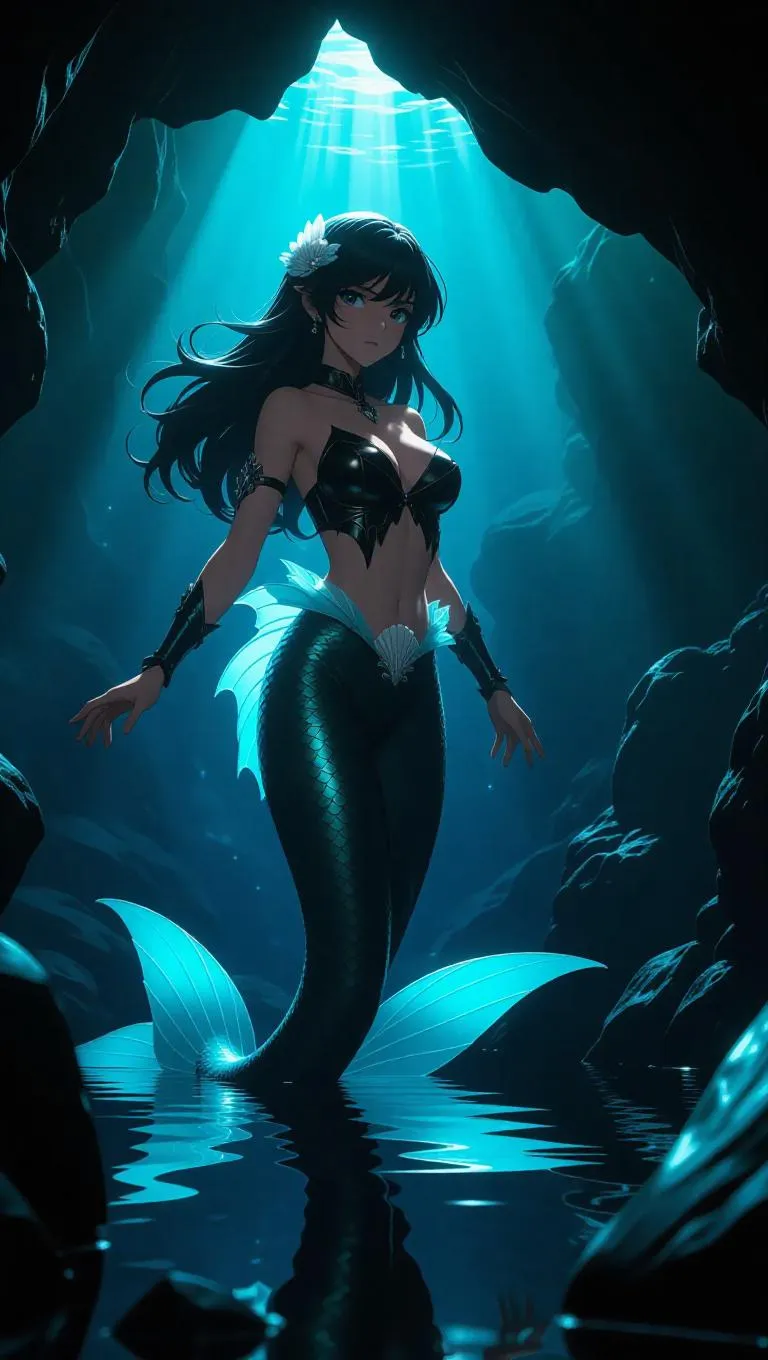 An anime mermaid princess emerges from a cave, her tail shimmering in the dark. She wears a protective leather top adorned with shells. Her expression is determined, and her pose is confrontational. The scene is set in a mystical underwater cave, with crystals glowing around her. Reflections dance across the surfaces, creating a magical environment. The style is adventurous and mysterious, focusing on sharp details and dramatic lighting.