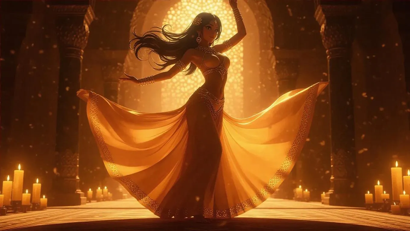 A graceful anime belly dancer in flowing, translucent fabrics and golden accessories, mid-spin with fabric trailing around her. She stands in a candlelit desert palace adorned with intricate mosaics, the air filled with a gentle incense haze. Soft, warm light from the candles casts a gentle glow, highlighting the dancer's fluid movements and the ornate details of the palace. The scene is infused with a sense of enchantment and mystique, capturing the essence of an ancient, mystical setting.