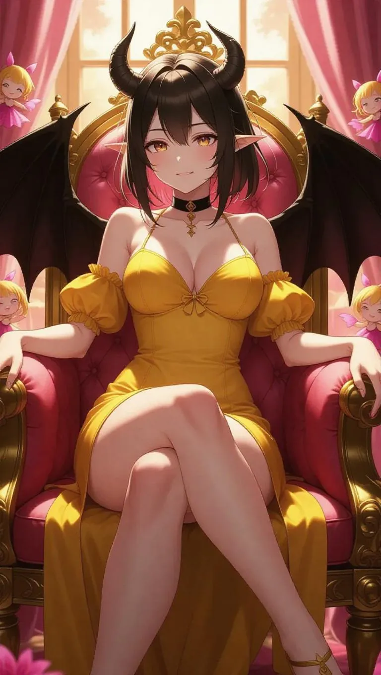 A fantasy succubus anime character with small black wings and delicate horns, wearing a form-fitting yellow dress, lounges against a plush throne. She has a soft expression, her eyes glowing with warmth. The scene is set in a sunlit castle interior, adorned with pink drapes and cheerful pixies fluttering around. Warm, golden light from the setting sun casts soft shadows, enhancing the serene and inviting atmosphere. Style: dark fantasy anime.
