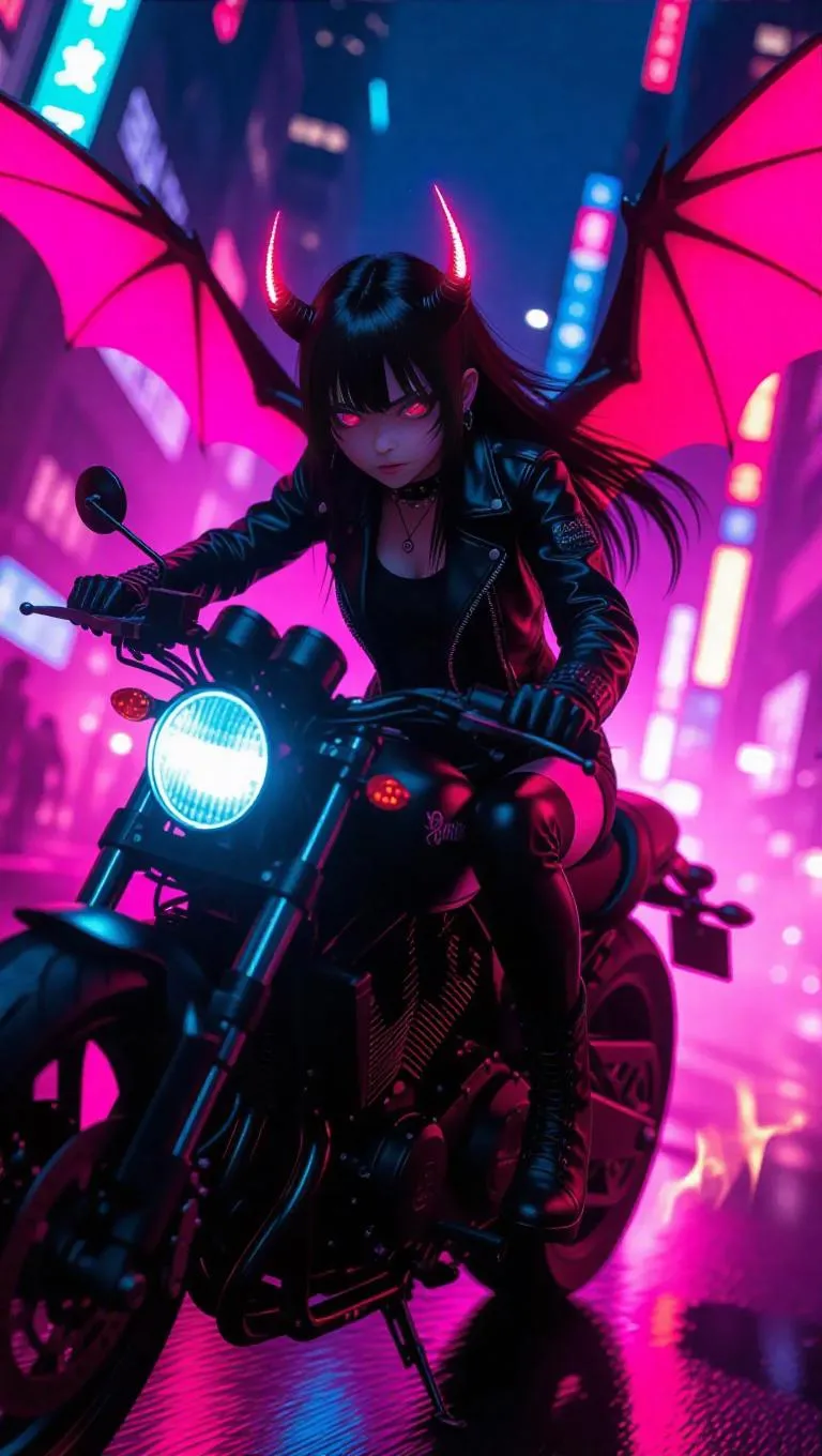 A rebellious anime demon girl with glowing red horns and shimmering wings rides a motorcycle through a neon-lit city at night. She wears a punk leather jacket that emphasizes her edge and coolness. Her eyes shine with thrill as she speeds past the buildings. Flames blaze in the colorful sky behind her, casting dynamic shadows and highlights. The scene pulses with vibrant pinks and electric blues, creating an energized and exhilarating atmosphere. The style merges street art and anime aesthetics, enhancing the bold and dynamic nature of the image.