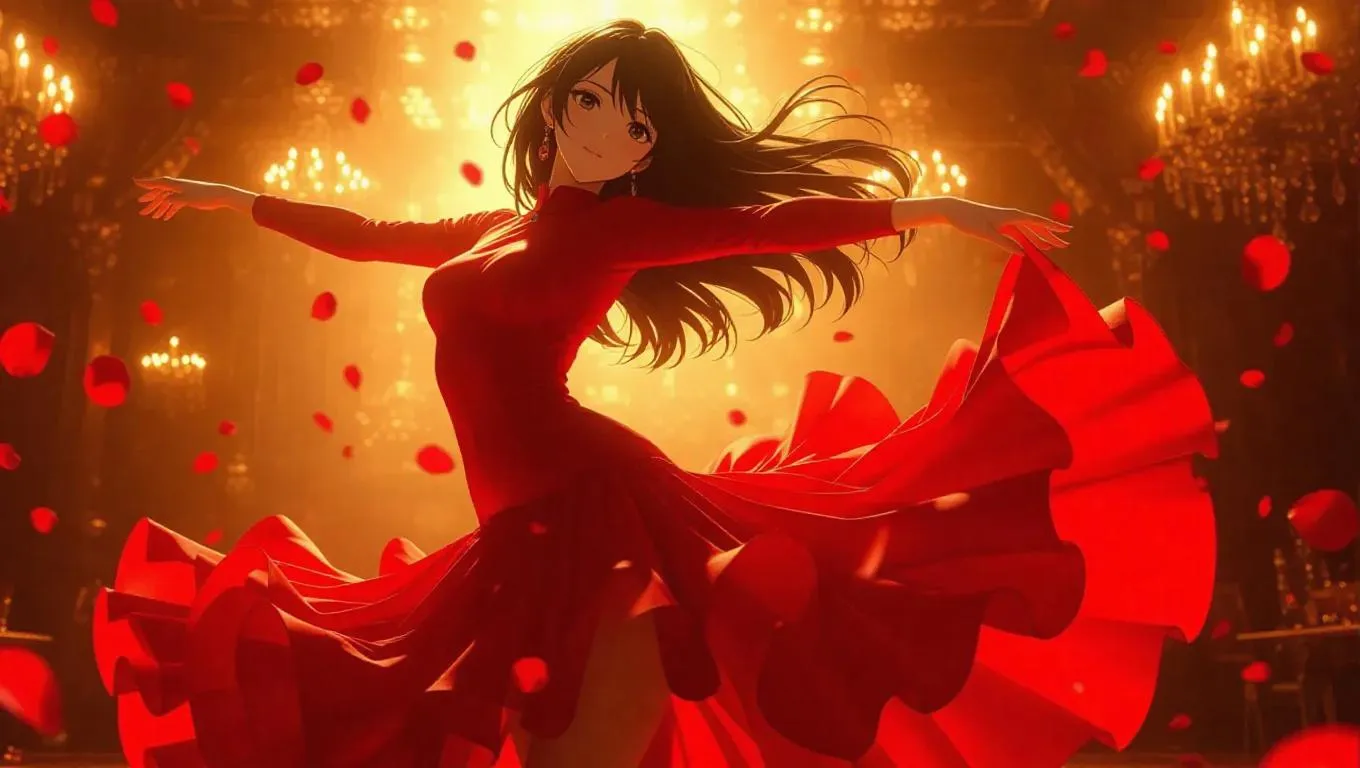 A sultry anime dancer in a red flamenco dress with long sleeves is frozen mid-spin, her body elegantly arched. Rose petals swirl around her, illuminated by warm golden stage lights that cast soft highlights on her flowing dress and create dramatic shadows. The background is a cozy, candle-lit venue, emphasizing her dynamic pose and the fluid motion of her dance.