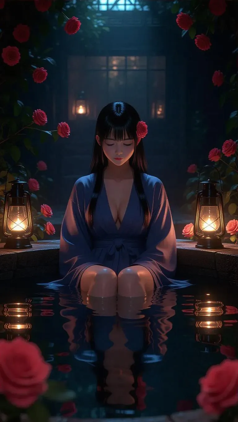 A luxury anime spa scene where a tall woman in a cozy robe softly lowers herself into a hot spring surrounded by roses. Soft steam, ambient lantern light, and delicate reflections enhance the mood.