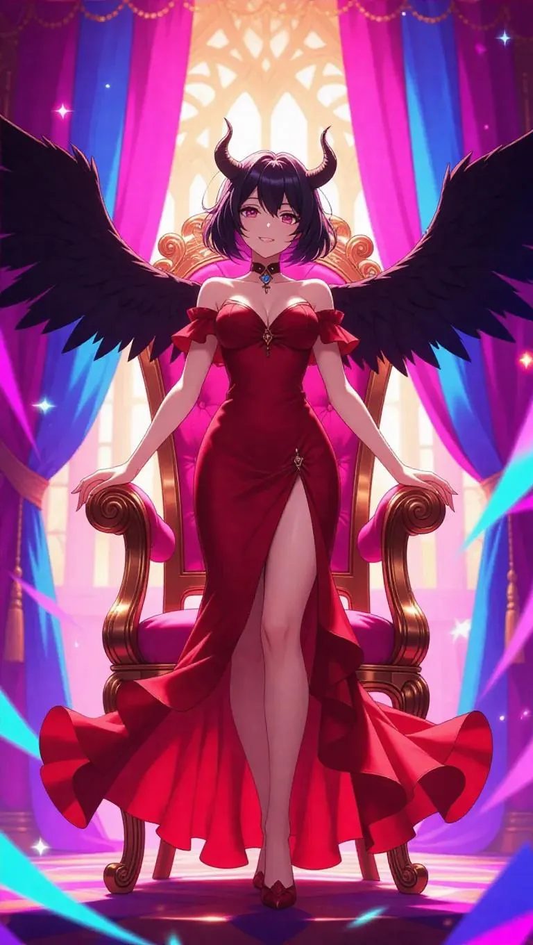 A fantasy succubus anime character with slender black wings and small horns, wearing a flowing red gown, dances gracefully atop a delicate throne. She has a joyful expression, her eyes sparkling with life. The scene is set in a vibrant castle interior, adorned with colorful drapes and swirling lights all around. Bright, cheerful light from magical sources casts whimsical shadows, enhancing the lively and festive atmosphere. Style: dark fantasy anime.