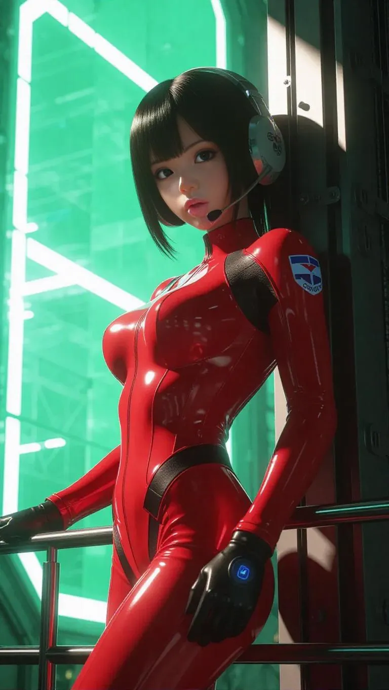 A futuristic anime pilot stands confidently in a vibrant red flight suit, her headset positioned snugly on her head. She leans casually against a sleek railing, lips gently curved, in front of a brightly lit aircraft hangar door. The scene is set in an advanced technological environment, with the hangar door radiating a striking green glow that illuminates her figure dramatically. The lighting is bright and sharp, highlighting the contours of her suit and the innovative backdrop. The style merges realism with anime, focusing on expressive poses and intricate machinery.