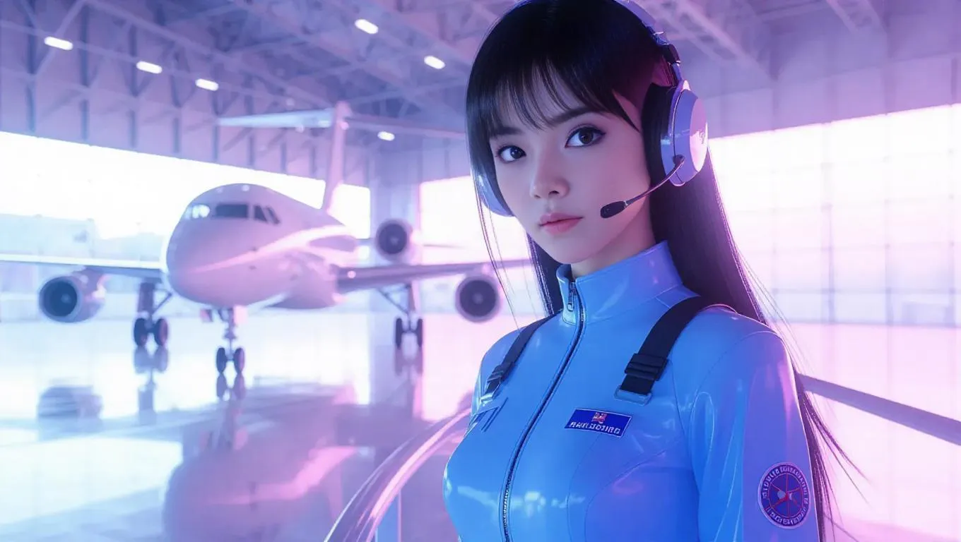 A futuristic anime pilot stands gracefully in a pastel blue flight suit, her headset resting loosely on her shoulders. She leans gently against a sleek railing, lips edged with curiosity, in front of a large aircraft hangar door. The atmosphere is set in an ultra-modern locale, with the hangar shining a soft lavender light that reflects a calm ambiance around her. The lighting is even and soothing, highlighting the elegant silhouette of her suit and the contemporary design. The style blends realism with anime, focusing on delicate poses and detailed environments.