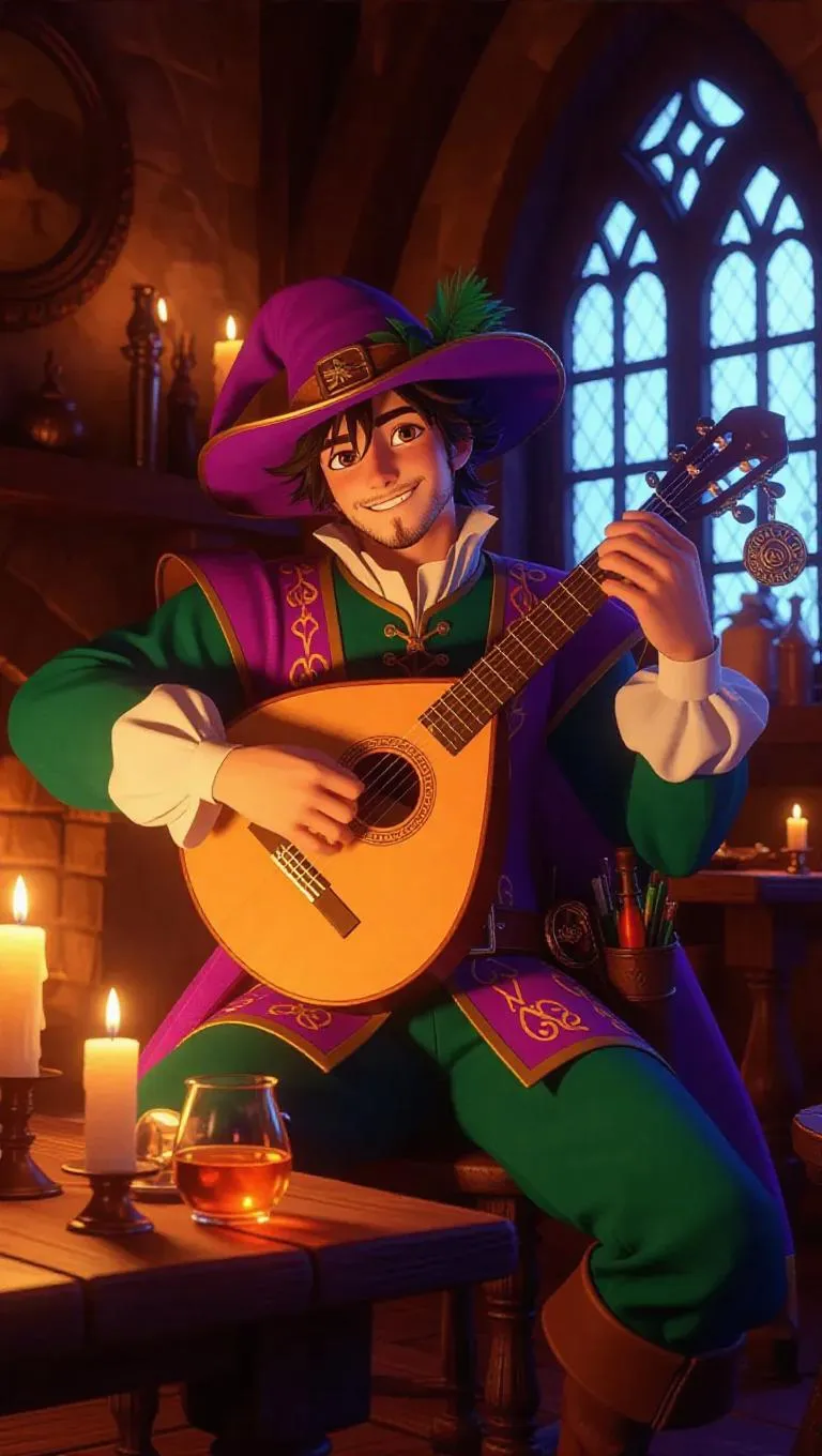 An anime bard in a colorful Renaissance outfit strums a lute beside a crackling fireplace, sipping from a flask of warm honey tea. His expression is cheerful and whimsical, eyes sparkling with creativity. The vintage tavern room is adorned with hand-painted murals and rustic tables, dimly lit by flickering candlelight that casts lively patterns on the walls.