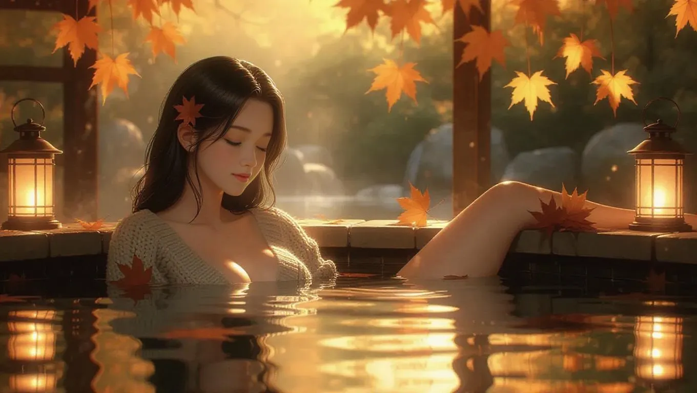 A luxury anime spa scene where a curvy woman in a cozy sweater gently lowers herself into a hot spring surrounded by maple leaves. Soft steam, ambient lantern light, and delicate reflections enhance the mood.