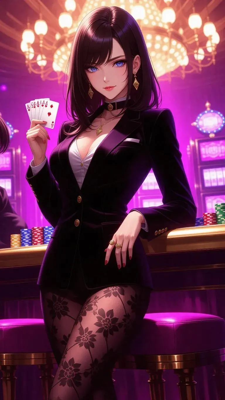 A stylish anime thief in a jet black velvet blazer, patterned leggings, and chic ankle boots leans casually on a silver casino table. She holds a deck of cards in one hand, her expression mischievous and enticing. Bold artwork adorns the background, lit by dynamic, flashy ambient lighting. The scene reflects thrill and audacity, with a flavor of cheeky charisma. Style: Anime, with a realistic touch.