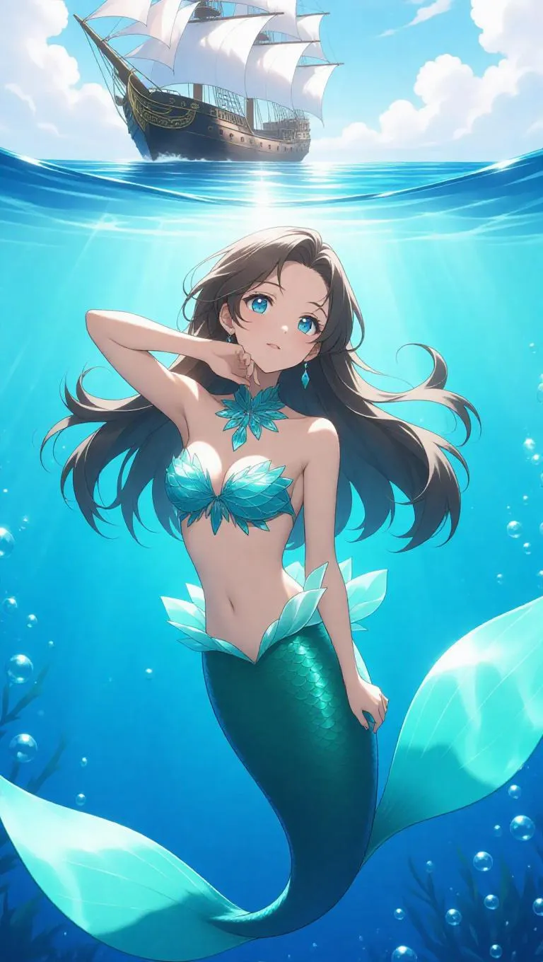An anime mermaid princess observes a ship above the surface, her tail elegantly arched. She wears an ornate top made of sea glass. Her expression is curious, and her pose is contemplative. The scene is set during a bright day, with a gentle breeze. The sun casts sparkles on the water, creating a whimsical look. The style is intricate and detailed, focusing on realistic elements and textures.