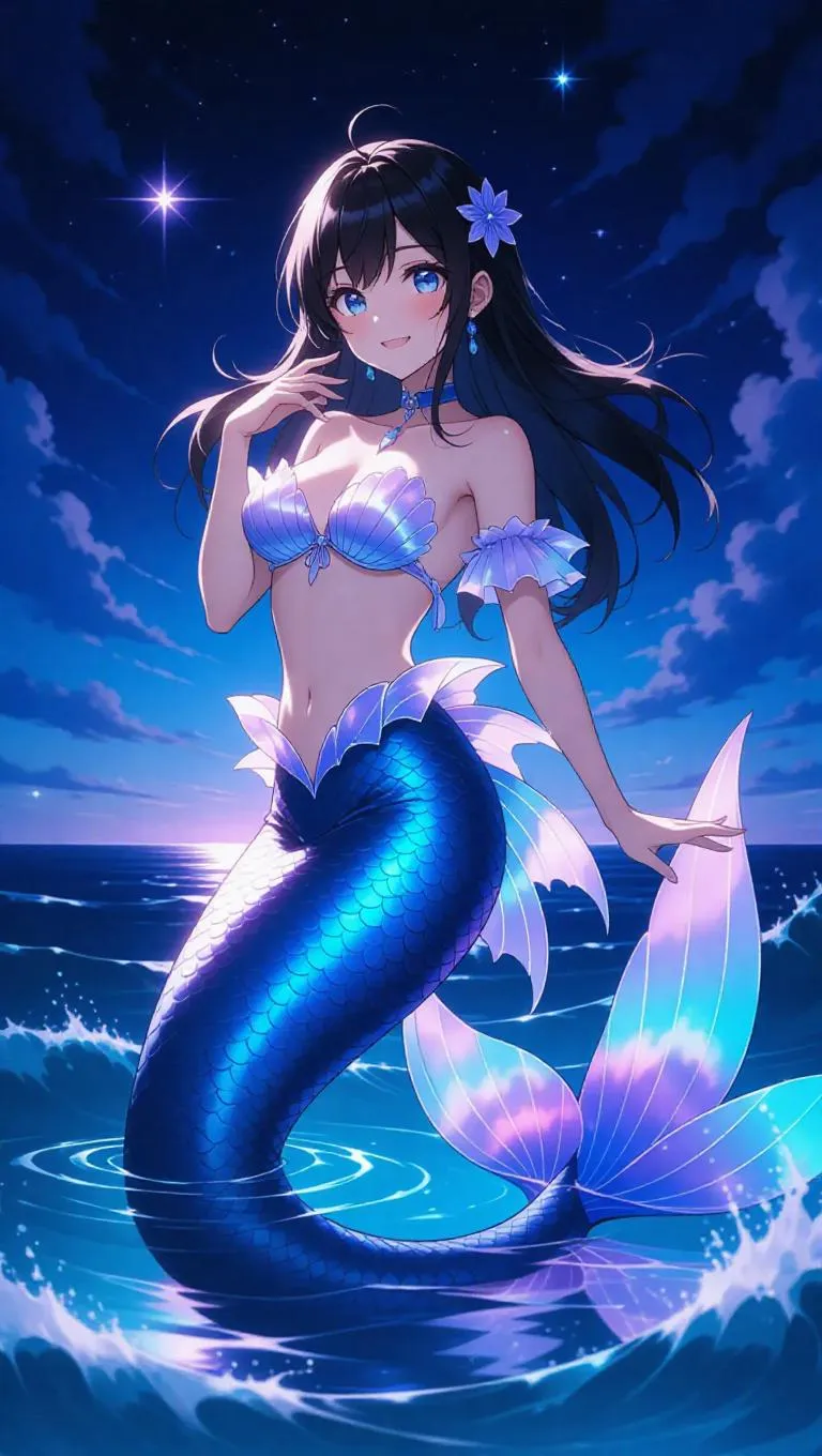 An anime mermaid princess emerges from the water, her shimmering tail arched dramatically. She wears a translucent seashell top that reflects the starlight. Her eyes are dreamy, and her pose is inviting. The scene is set under a starry night sky, with gentle waves lapping around her. Soft, warm moonlight casts a gentle glow, highlighting her ethereal beauty. The style is vibrant and colorful, with a focus on detailed, flowing lines and dynamic composition.