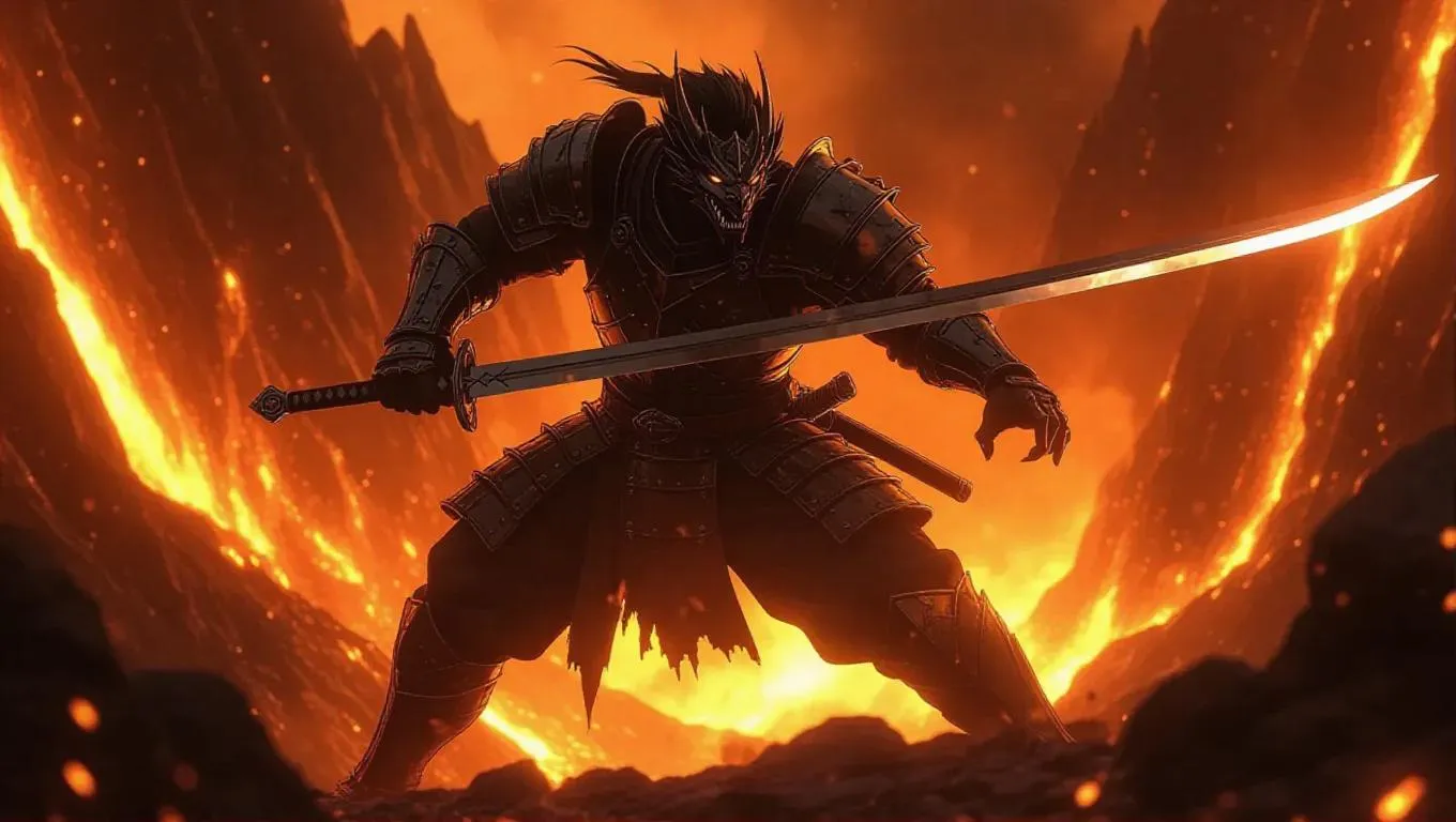A fierce anime dragon slayer in rugged leather armor, mid-swing with a massive sword. He stands in a volcanic landscape adorned with flowing lava, the air thick with heat. Intense, orange light from the molten rock casts an aggressive glow, highlighting the slayer's battle-ready stance and the fiery details of the surroundings. The scene is infused with a sense of danger and excitement, capturing the essence of an epic confrontation.