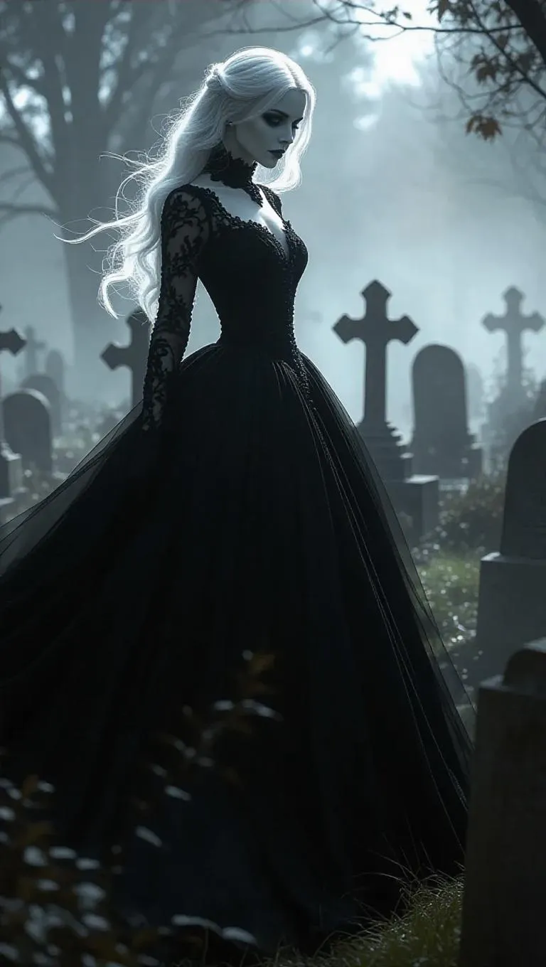 A haunting specter queen in a shadowy black gown, embroidered with ghostly wisps, glides through the fog. Her ethereal silver hair floats like mist, and her empty eyes glow faintly. She is set against a haunted graveyard backdrop, with mist curling around the tombstones, creating a chilling and eerie atmosphere. The scene is shrouded in a murky, gray light, enhancing the mysterious and haunting mood. Style: Realistic fantasy.