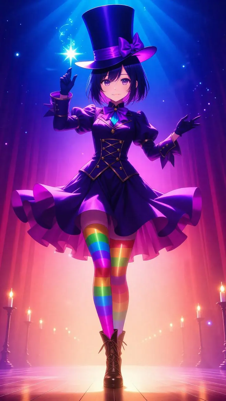 An anime girl magician in a retro outfit, colorful tights, and metallic gloves dramatically pulls a glowing spell from her top hat. She stands in a spotlight on a darkened theater stage, her pose emphasizing the magical moment. Soft, warm stage lights highlight her figure, creating a sense of mystery and enchantment. The background fades into shadows, focusing all attention on her. The style is a blend of anime and theatrical realism, enhancing the dramatic effect.