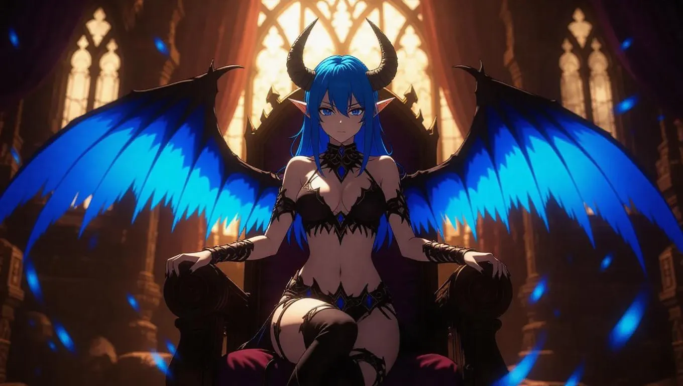 A fantasy succubus anime character with glowing blue wings and angular horns, wearing a tribal-inspired outfit, stands proudly on a rugged throne. She has a fierce demeanor, her eyes radiating confidence. The scene is set in a wild castle interior, adorned with earthy drapes and elemental spirits spinning around. Strong, vivid light from nature elements casts dynamic shadows, enhancing the bold and adventurous atmosphere. Style: dark fantasy anime.