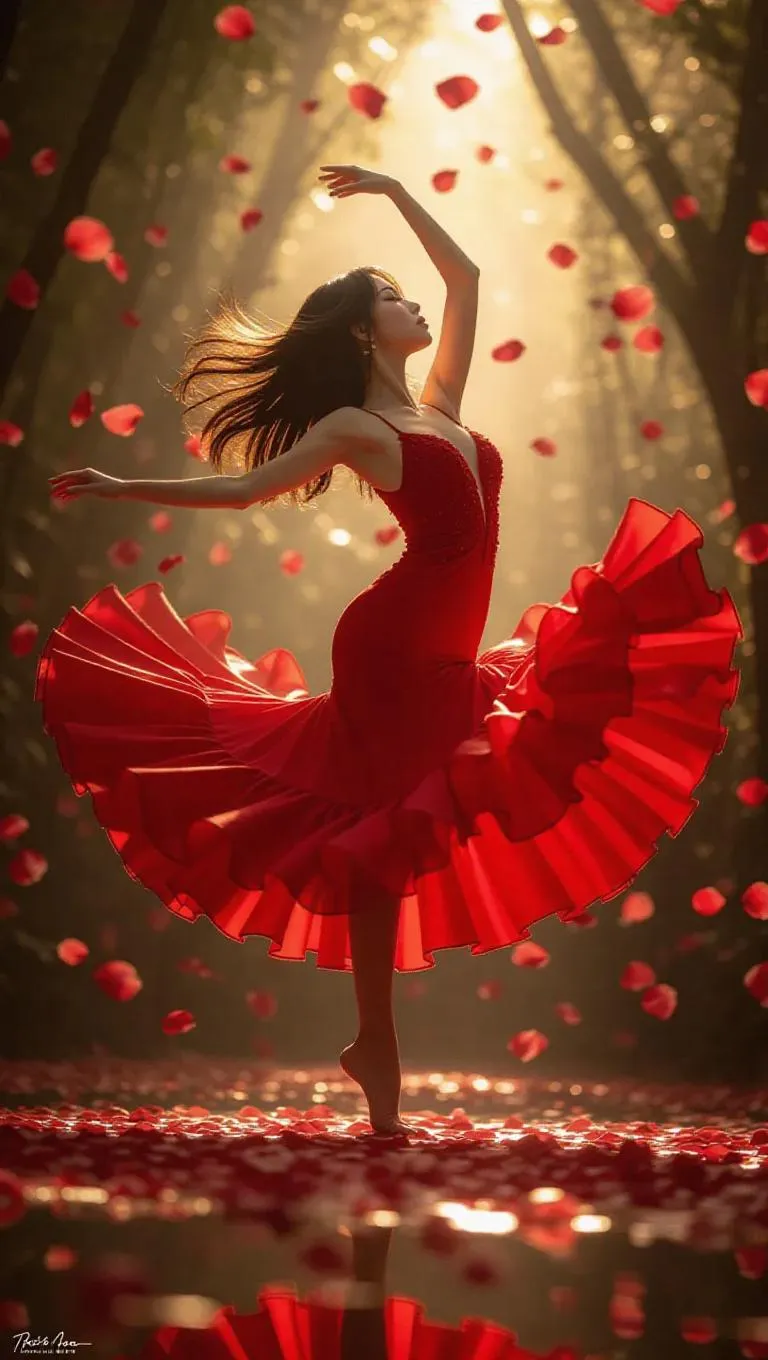 A sultry anime dancer in a red flamenco dress with delicate frills is frozen mid-spin, her body elegantly arched. Rose petals swirl around her, illuminated by soft ambient lights that cast soft highlights on her flowing dress and create dramatic shadows. The background is a misty woodland, emphasizing her dynamic pose and the fluid motion of her dance.