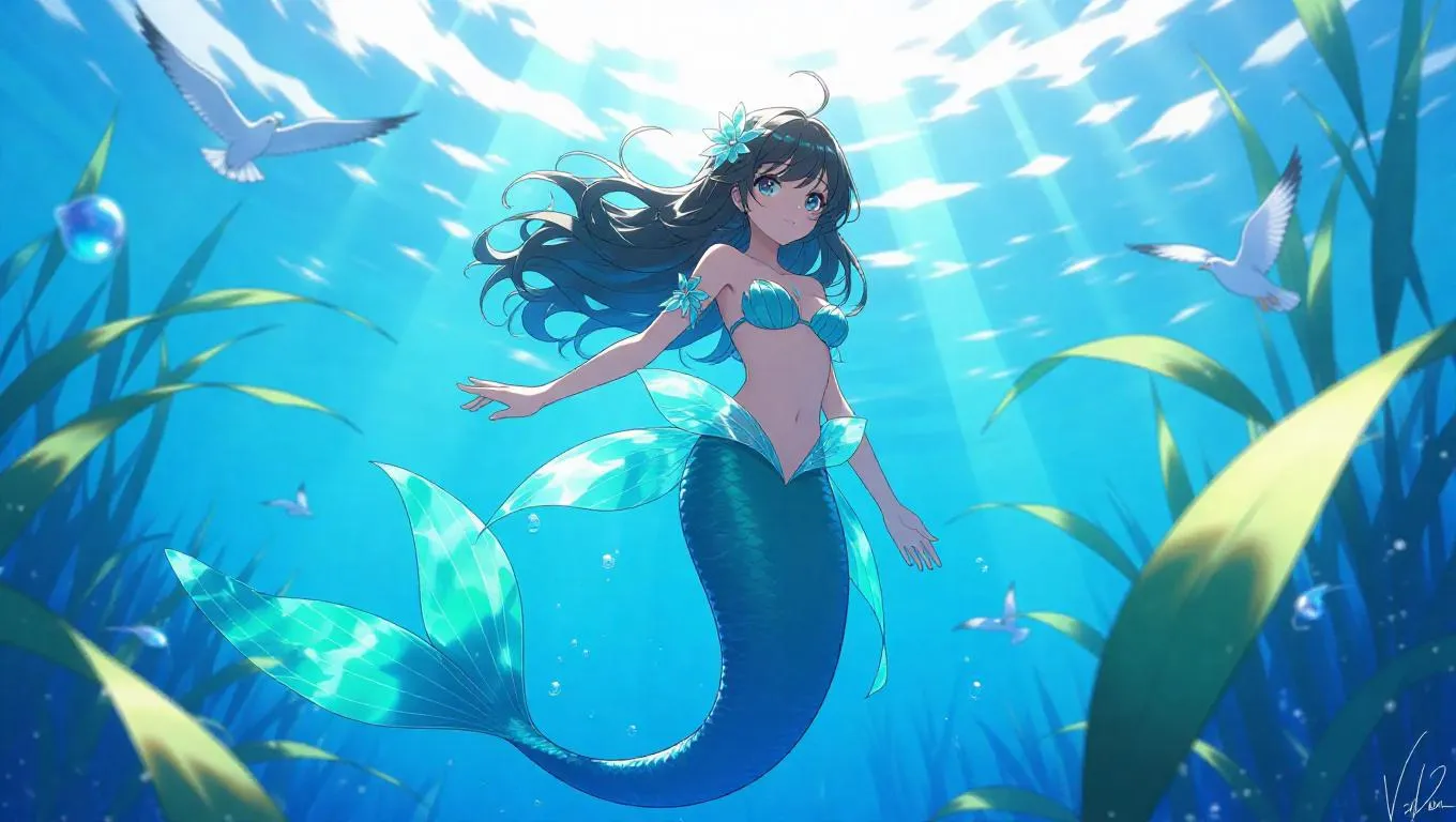 An anime mermaid princess floats serenely on the surface, her tail catching glimmers of sunlight. She wears a flowing seaweed top that blends with the ocean. Her eyes are wise and ancient, and her pose suggests tranquility. The scene is set during high tide, with birds soaring above her. Bright sunlight splashes over the scene, enhancing the peaceful vibes. The style is calm and harmonious, with soft outlines and pastel colors.