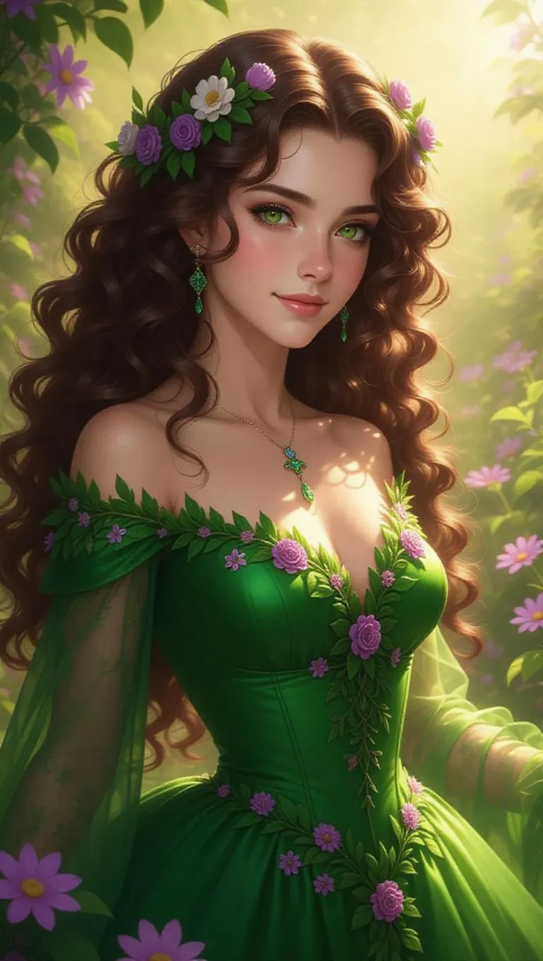 A nurturing earth queen in a vibrant green gown, embroidered with flowers and vines, stands in a lush garden. Her curly brown hair blooms with blossoms, and her warm green eyes exude kindness. She is set against a blooming garden backdrop, with flowers bursting into color, creating a warm and welcoming atmosphere. The scene is illuminated by bright, cheerful sunlight, enhancing the nurturing and lively mood. Style: Realistic fantasy.