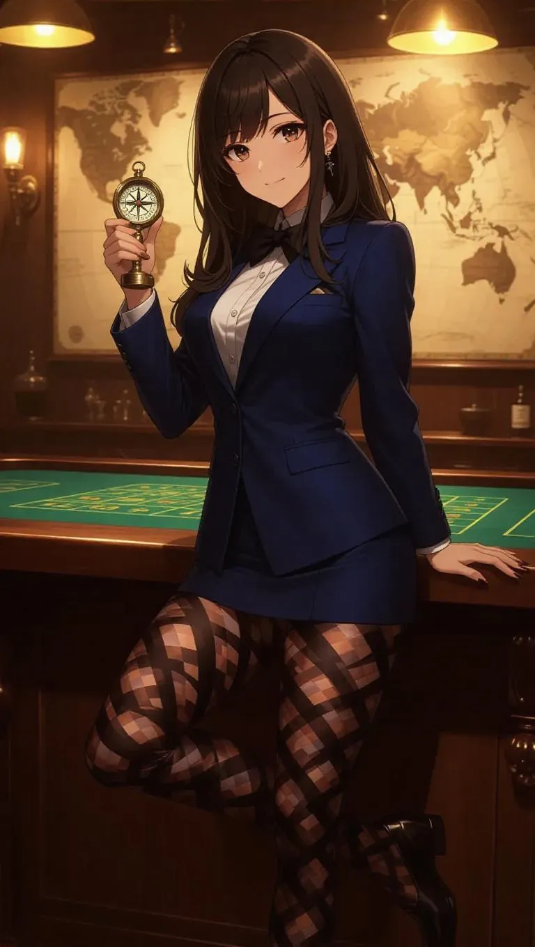 A daring anime explorer in a navy blue tuxedo blazer, bold patterned tights, and casual loafers leans confidently on a rustic casino table. She holds a compass in one hand, her expression adventurous and playful. Vintage maps decorate the background, under warm, inviting ambient lighting. The scene brings forth a sense of excitement and curiosity, mingled with whimsical charm. Style: Anime, with a realistic touch.