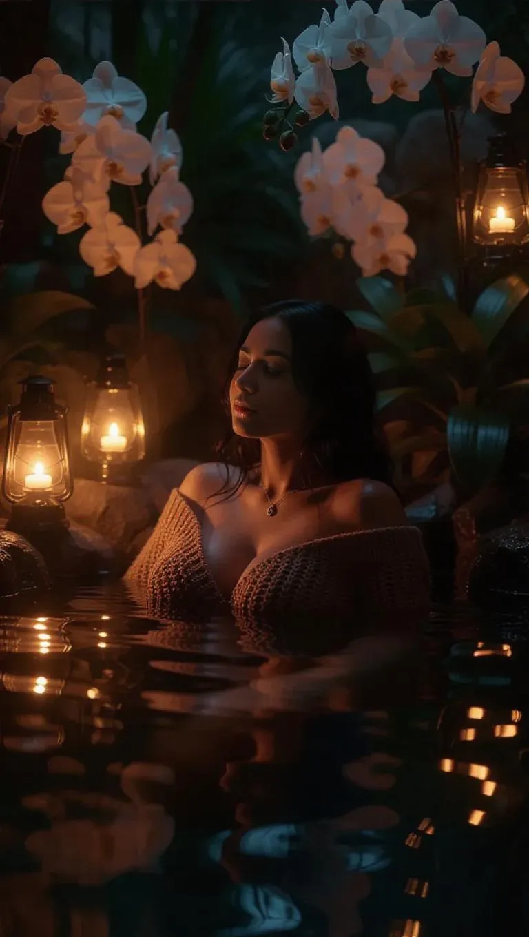 A luxury anime spa scene where a curvy woman in a knitted sweater lowers herself into a hot spring surrounded by orchids. Soft steam, ambient lantern light, and delicate reflections enhance the mood.
