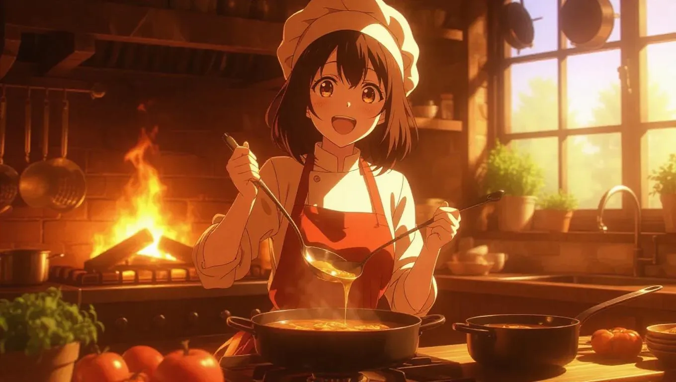 An anime cook in a cheery apron prepares a feast beside a crackling fireplace, testing a spoonful of soup. Her expression is joyful and enthusiastic, eyes sparkling with culinary delight. The warm kitchen is filled with hanging herbs and dishes, illuminated by a warm golden light that enhances the cozy, inviting atmosphere.