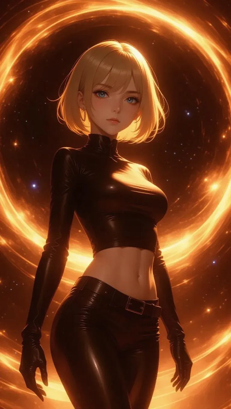 An anime sorceress with sleek bob-cut blonde hair stands in a summoning circle, her fitted top and high-top boots accentuating her figure. She summons magic, with spiraling galaxies encircling her, casting a cosmic light. The wind swirls around her, adding a surreal energy to the scene. The environment is outer space and vast, with stars twinkling in the background. The lighting is deep and cosmic, highlighting her thoughtful expression and the intricate details of the magic circles. Style: Anime, with a touch of cosmic adventure.