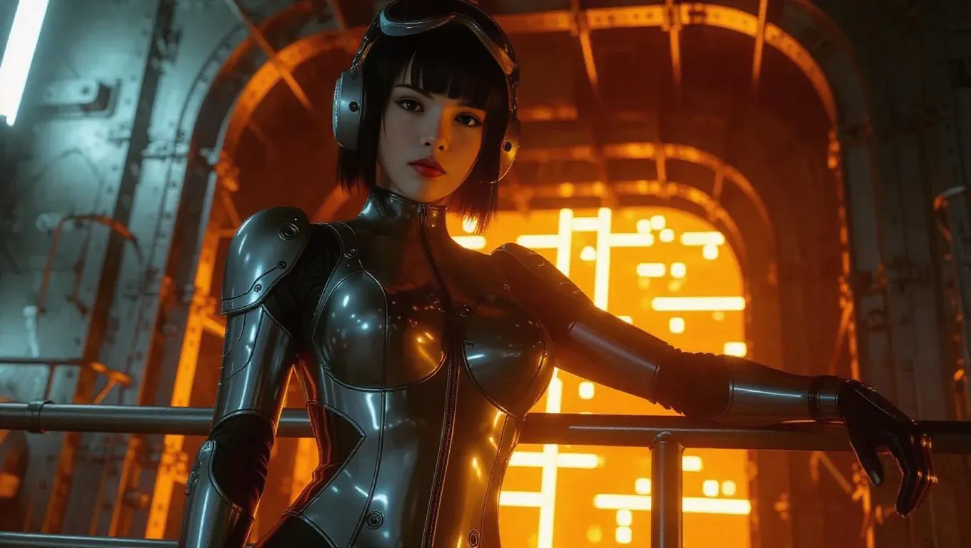 A futuristic anime pilot is poised elegantly in a metallic silver flight suit, her headset stylishly perched on her head. She leans assertively against a robust railing, lips slightly smirking, in front of a flickering aircraft hangar door. The environment is set in a sleek urban landscape, with the hangar door casting a warm, orange glow that envelops her form. The lighting is vivid and contrasted, enhancing the angles of her suit and the modern scene. The style blends realism and anime, underscoring action poses and technological details.