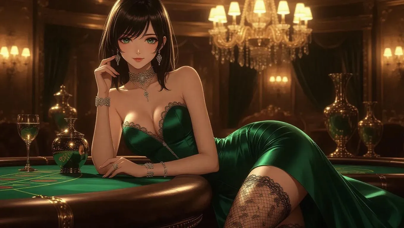 A glamorous anime socialite in a silk emerald gown, lace-trimmed stockings, and designer heels leans elegantly on a plush black casino table. She holds a glamorous clutch in one hand, her expression poised and inviting. Elegant vases adorn the background, illuminated by a soft, golden glow of ambient lighting. The scene radiates opulence and sophistication, tinged with playful elegance. Style: Anime, with a realistic touch.