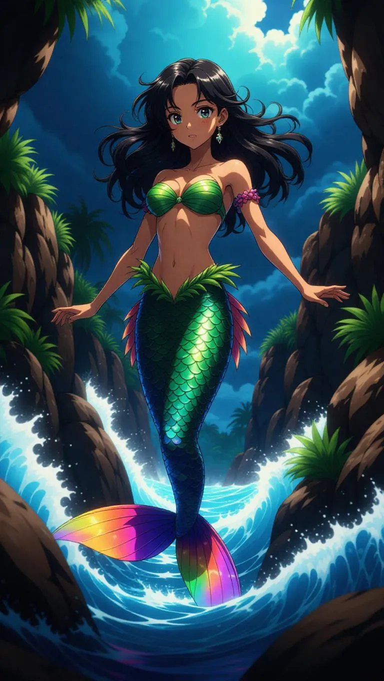 An anime mermaid princess navigates through a maze of rocks, her tail flashing colors. She wears a stylish top made from woven palm leaves. Her expression is focused, and her pose is determined. The scene is during a storm at sea, with waves crashing around her. Dark clouds loom overhead, adding tension to the environment. The style is dramatic and bold, with strong contrasts and dynamic composition.