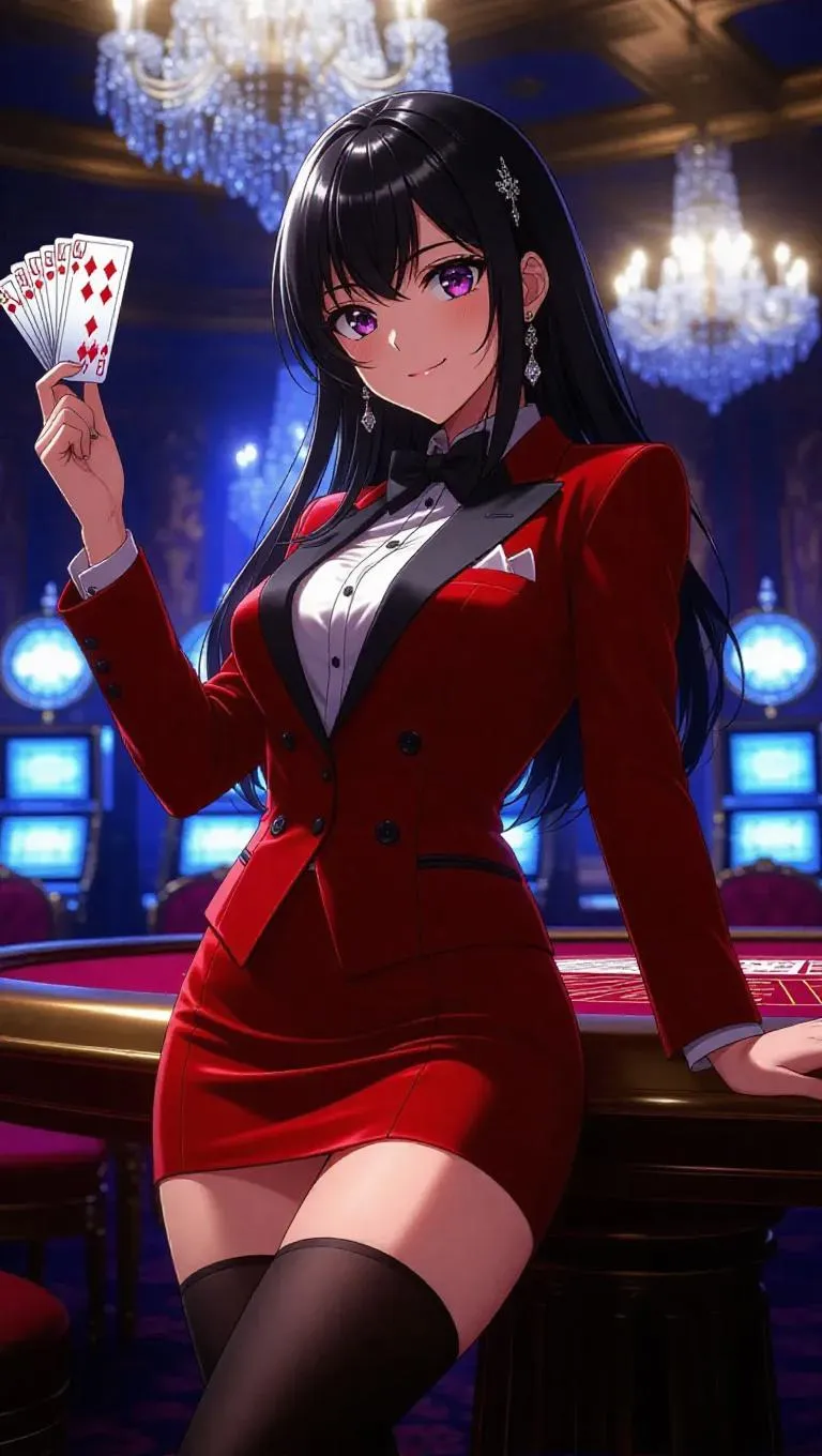 A confident anime magician in a red velvet tuxedo suit, knee-high socks, and elegant flats leans back against a mahogany casino table. She holds a staff of cards in one hand, her expression mysterious and alluring. Crystal chandeliers shimmer in the background, lit by bright, cool ambient lighting. The scene conveys excitement and wonder, with a hint of dramatic flair. Style: Anime, with a realistic touch.
