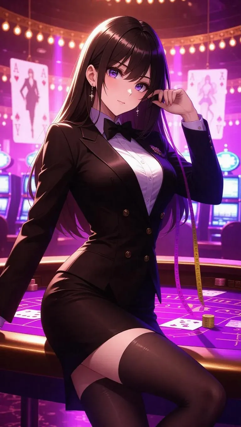 A bold anime fashion designer in a striking black tuxedo dress, sheer high stockings, and chic platform heels leans artistically on a fashion-forward casino table. She holds a tape measure in one hand, her expression creative and vibrant. Fashion sketches adorn the background, bathed in bright, colorful ambient lighting. The scene pulses with style and innovation, sprinkled with charismatic energy. Style: Anime, with a realistic touch.