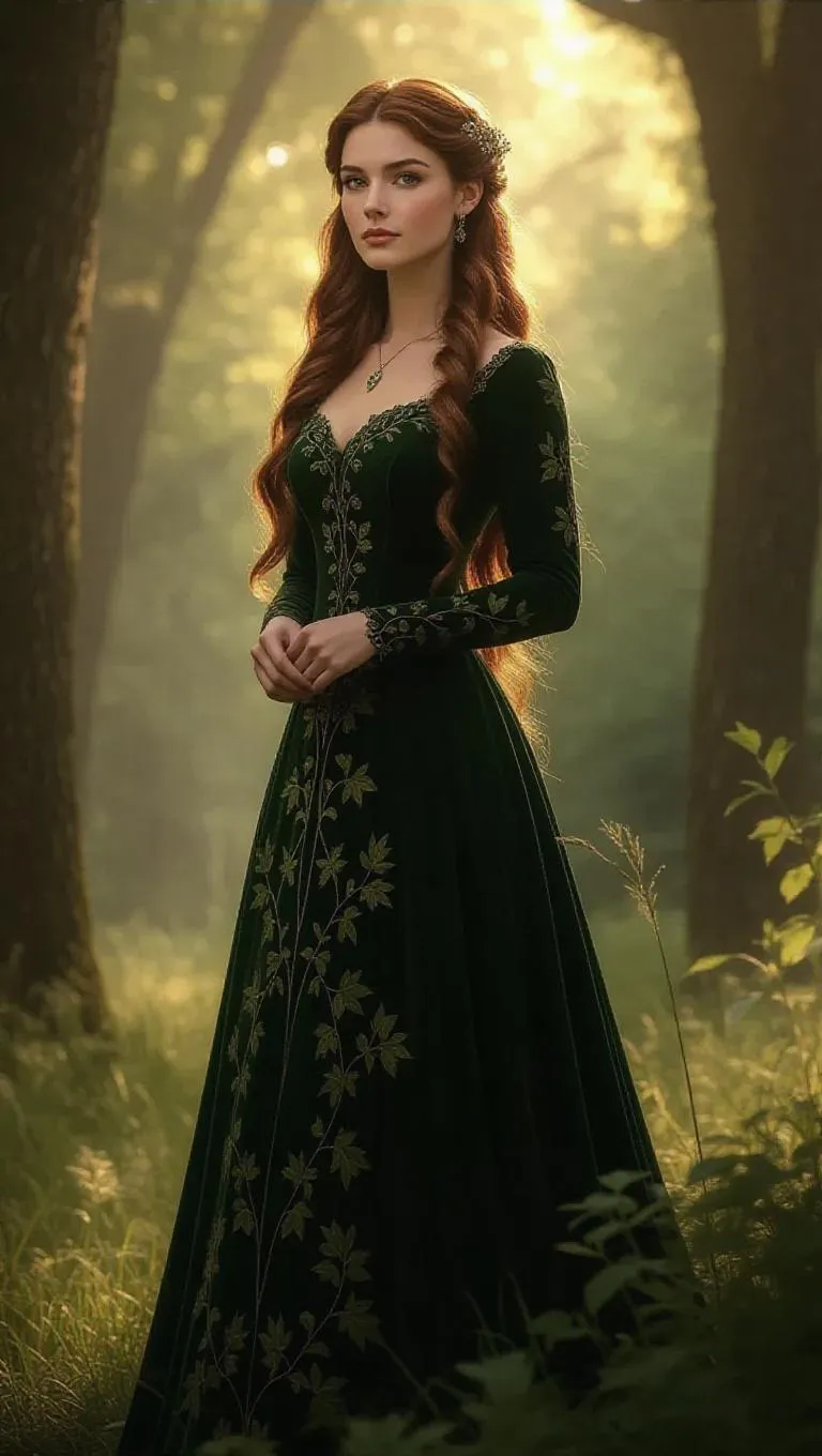 A noble centaur queen in a forest green gown, embroidered with vines, stands gracefully on a grassy knoll. Her long chestnut hair flows like cascading leaves, and her wise hazel eyes gaze thoughtfully. She is set against an enchanted meadow backdrop, with soft breezes rustling the foliage, creating a serene and peaceful atmosphere. The scene is illuminated by warm, soft daylight, enhancing the calm and harmonious mood. Style: Realistic fantasy.