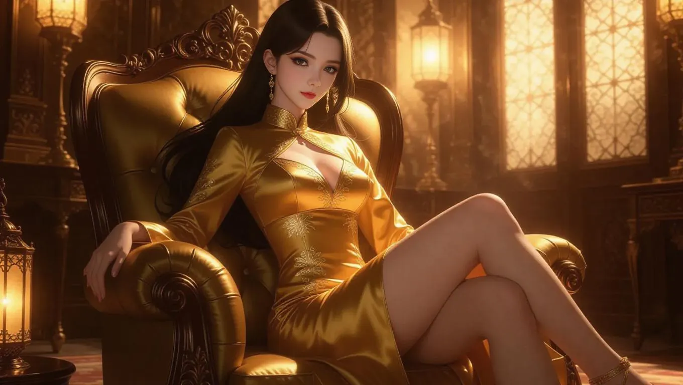 A stunning anime woman in a flowing gold silk cheongsam with high side slits sits regally on a plush armchair. Her long raven hair is elegantly styled, and her sharp, enchanting eyes add to her allure. The atmospheric lantern light casts soft, golden shadows around her, enhancing the luxurious atmosphere of the palace adorned with gold accents and warm tones.
