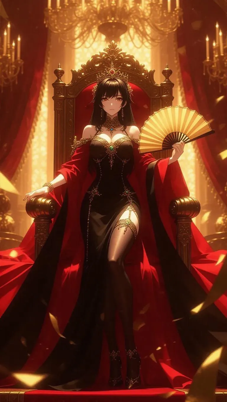 A regal anime empress in elaborate royal garments, mid-decree with an ornate fan. She stands in a throne room adorned with precious gems, the air filled with whispers of her court. Rich, warm light from opulent chandeliers casts a grand glow, highlighting the empress's commanding presence and the luxurious details of her attire. The scene is infused with a sense of authority and power, capturing the essence of a majestic reign.