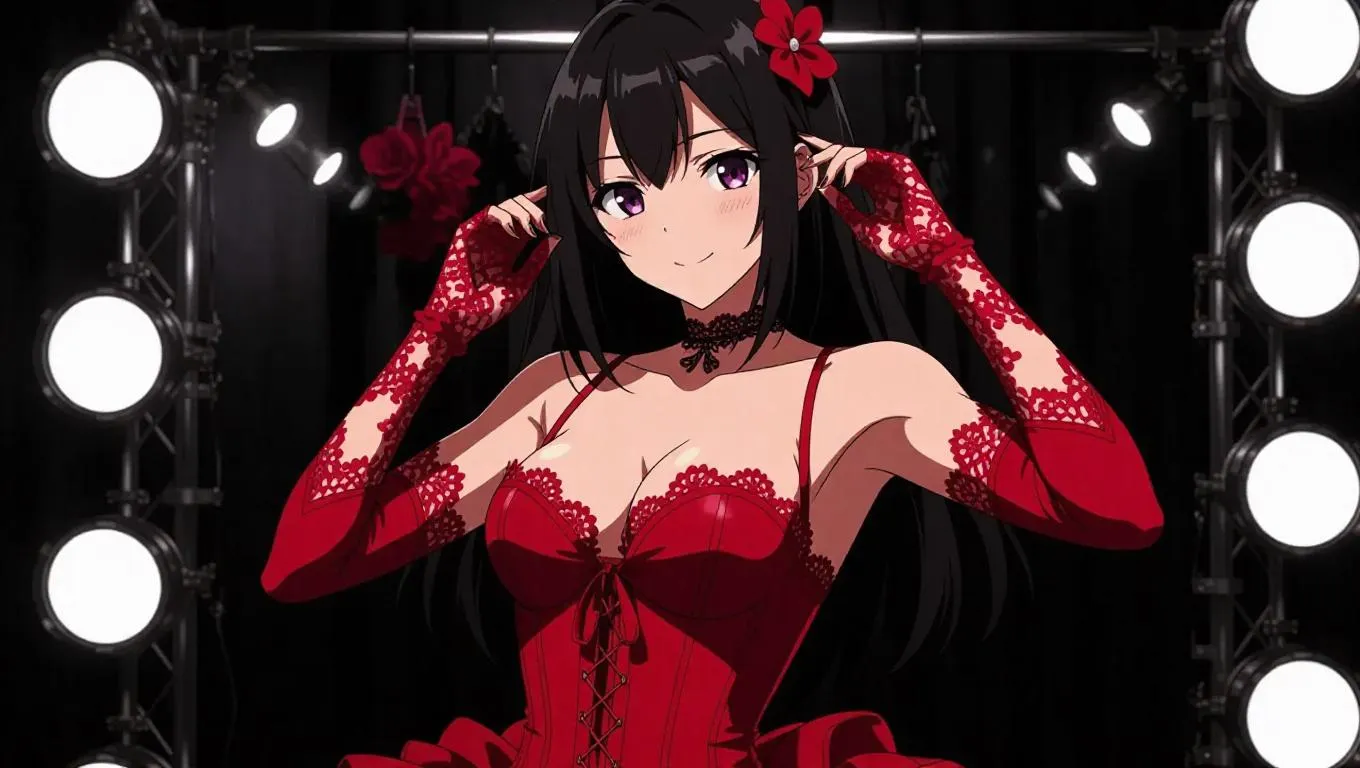 An anime model in a striking red lace corset dress and lace fingerless gloves poses backstage at a glamorous fashion show. She looks over her shoulder playfully, her open-toed heels catching the glint of studio spotlights. The backstage area is dimly lit, with strategic lighting creating intense contrasts and highlighting her playful, mischievous smile. The style mixes dramatic fashion and anime aesthetics, focusing on bold lines and eye-catching shadows.