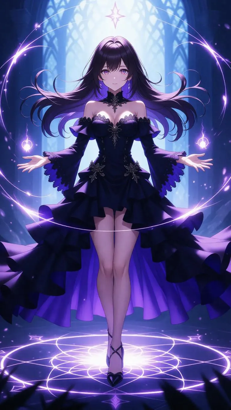 An anime sorceress with cascading raven hair stands in a summoning circle, her elaborate gown and delicate heels accentuating her figure. She summons magic, with luminous orbs encircling her, casting an enchanting light. The gentle breeze swirls around her, adding a magical energy to the scene. The environment is enchanting and mystical, with will-o'-the-wisps flickering in the background. The lighting is soft and enchanting, highlighting her mystical expression and the intricate details of the magic circles. Style: Anime, with a touch of elegance and enchantment.