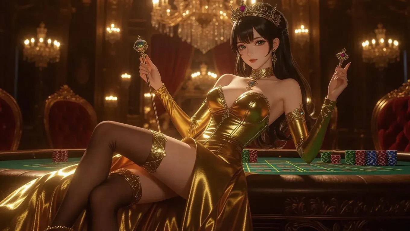 An enchanting anime queen in a lavish golden tuxedo gown, intricate thigh-high stockings, and magnificent heels leans regally on a royal-themed casino table. She holds a jeweled scepter in one hand, her expression commanding and graceful. Opulent crowns sparkle in the background, highlighted by soft, sumptuous ambient lighting. The scene resonates with majesty and elegance, layered with a sense of royal allure. Style: Anime, with a realistic touch.