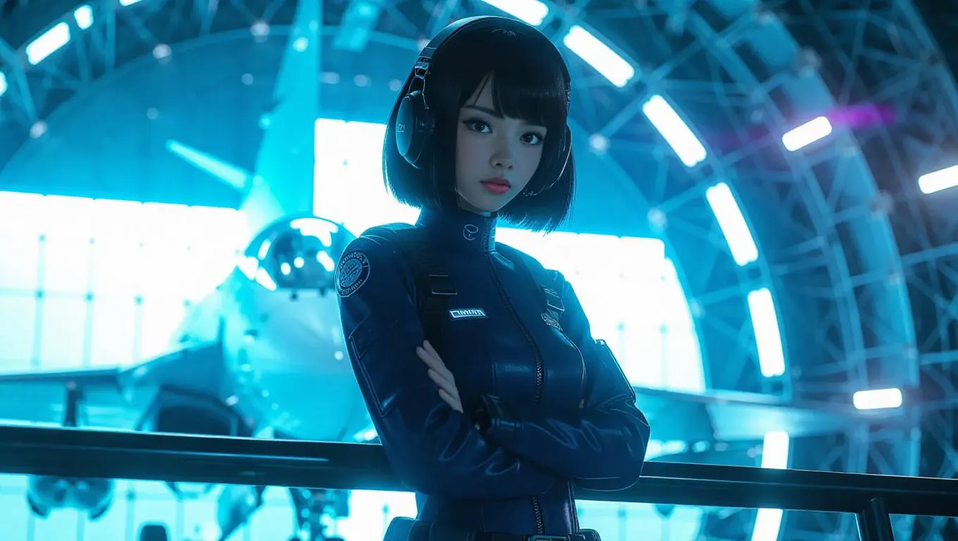 A futuristic anime pilot stands with intensity in a dark indigo flight suit, her headset positioned securely on her head. She leans against a futuristic railing, lips pursed in concentration, in front of a high-tech aircraft hangar door. The environment blossoms within a technologically advanced setting, with the hangar door emitting a soft teal glow that defines her outlines. The lighting is strategically dimmed, enhancing the structure of her suit and the overall backdrop. The style artistically intertwines realism and anime, accentuating dynamic figures and complex machinery.