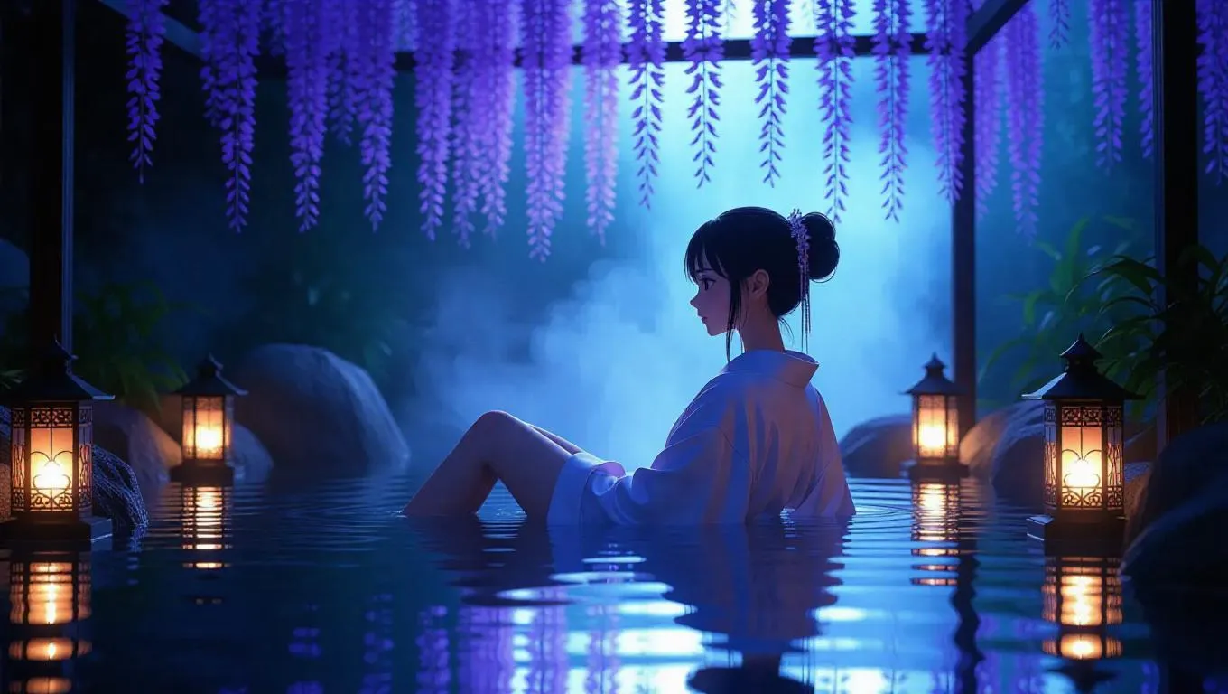 A luxury anime spa scene where a petite woman in a silky robe playfully lowers herself into a hot spring surrounded by wisteria. Soft steam, ambient lantern light, and delicate reflections enhance the mood.