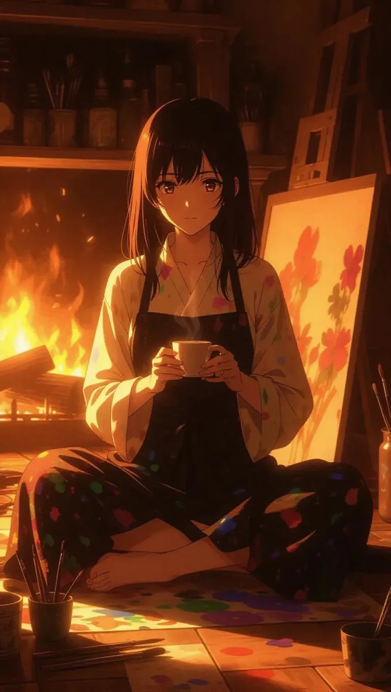 An anime artist in a paint-splattered Renaissance smock sits cross-legged before a crackling fireplace, cradling a cup of herbal tea. Her expression is contemplative and inspired, eyes sparkling with creativity. The cozy studio is filled with canvases and scattered brushes, illuminated by warm golden light that dances across her colorful creations.