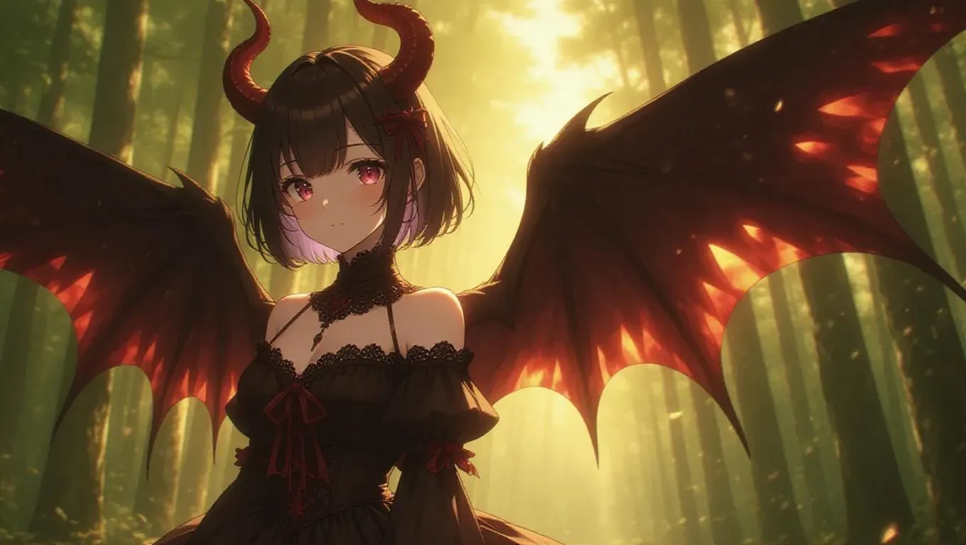 An elegant anime demon girl with glowing red horns and shimmering wings stands in a quiet forest at dawn. She wears an intricate gothic dress that adds to her mystical presence. Her eyes are filled with curiosity as she surveys her surroundings. Flames dance gently in the serene sky behind her, casting subtle shadows and highlights. The scene is enveloped in soft green and ethereal lavender lights, creating a peaceful and magical atmosphere. The style is a combination of fantasy and anime aesthetics, enhancing the otherworldly and serene nature of the image.