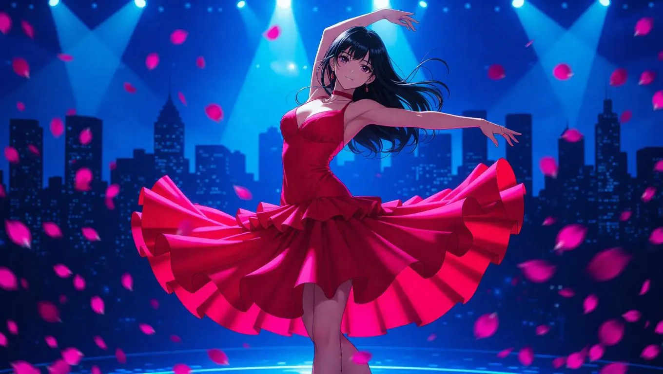 A sultry anime dancer in a red flamenco dress with a ruffled hem is frozen mid-spin, her body elegantly arched. Rose petals swirl around her, illuminated by neon blue stage lights that cast soft highlights on her flowing dress and create dramatic shadows. The background is a vibrant city skyline, emphasizing her dynamic pose and the fluid motion of her dance.