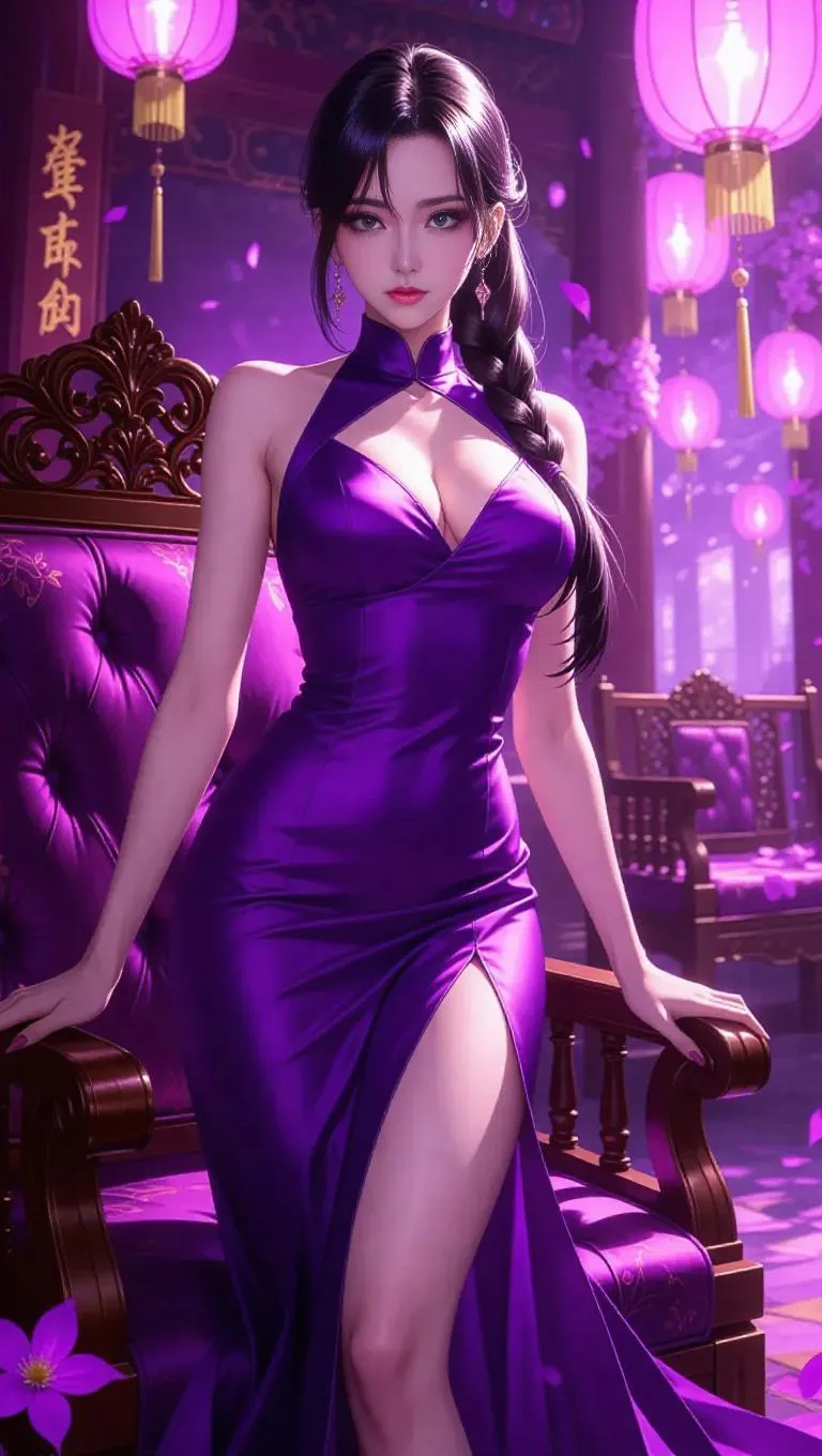 A stunning anime woman in a flowing violet silk cheongsam with high side slits stands poised beside an elaborate wooden armchair. Her long dark hair is styled into an elegant braid, and her sharp, striking eyes add to her allure. The soft glow of lanterns casts delicate shadows around her, enhancing the enchanting atmosphere of the festival adorned with vibrant accents and violet tones.